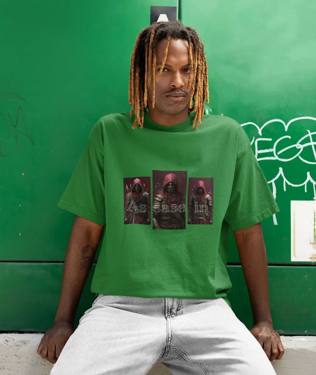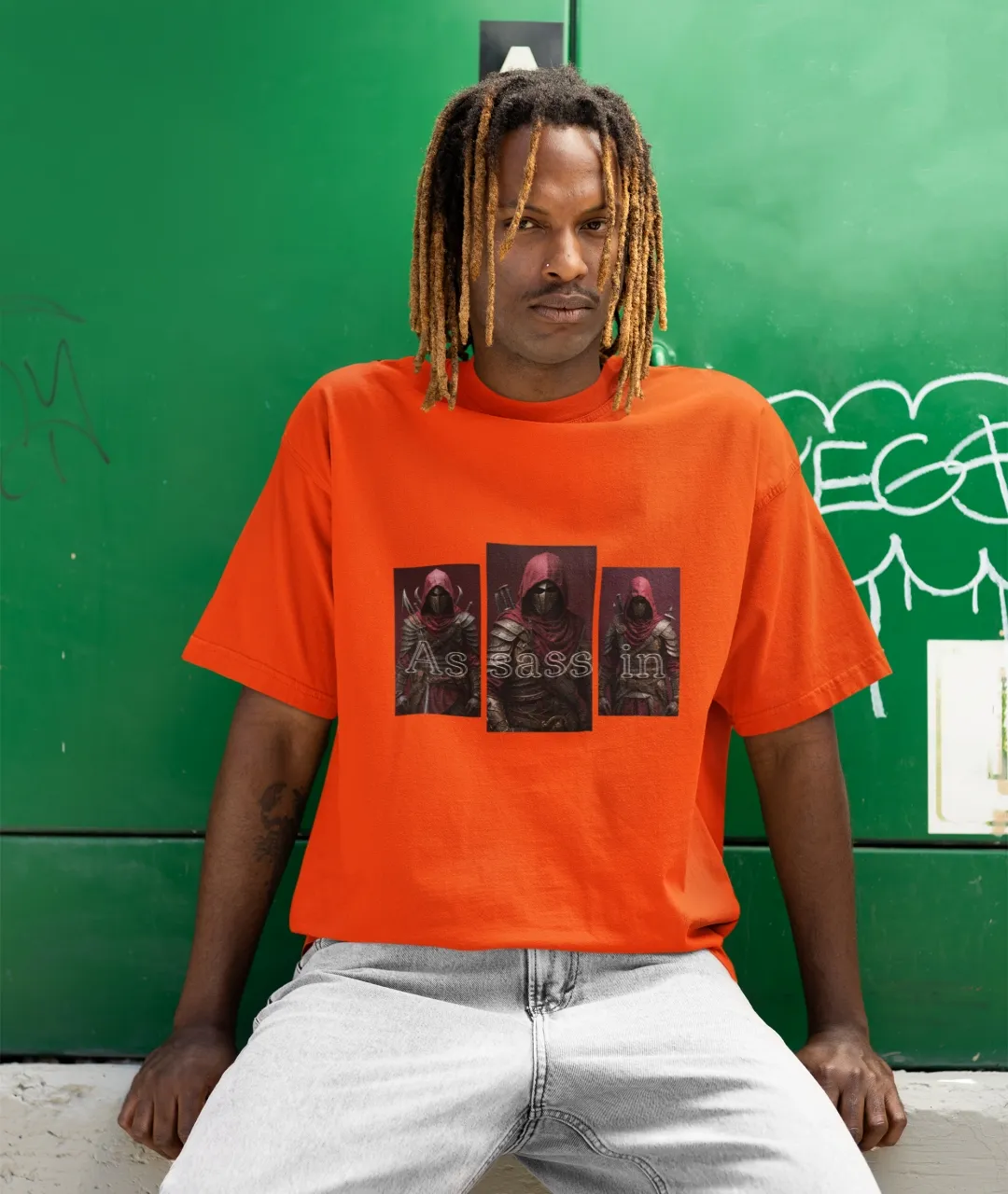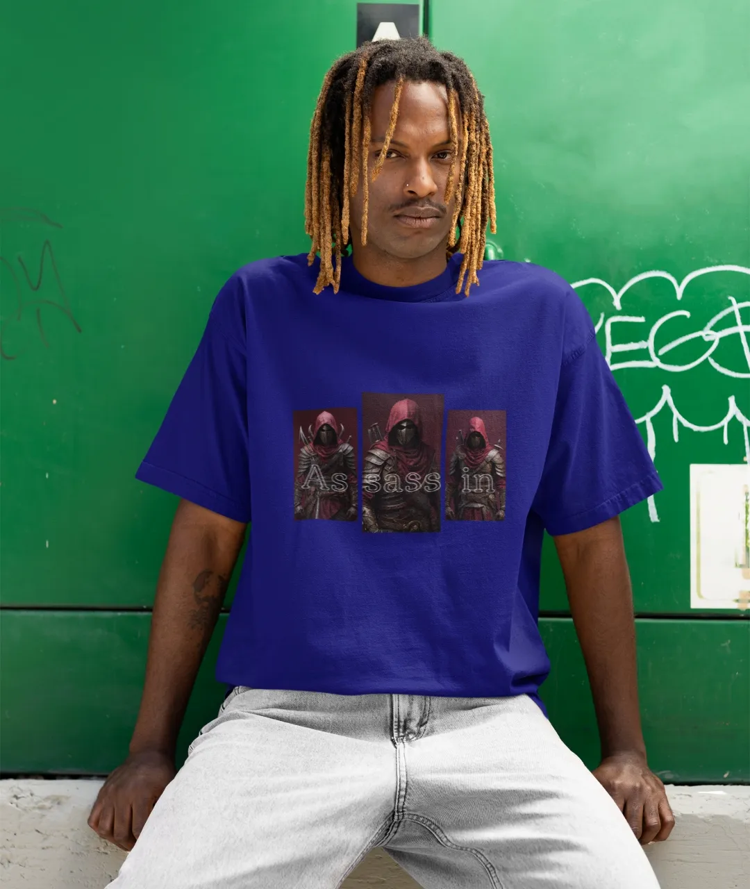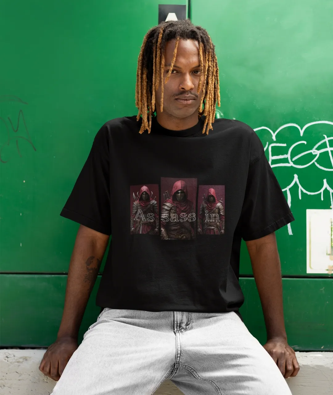 Tişörtün arka planındaki karanlık, bordo ve siyah tonların hakim olduğu “assassin” (suikastçı) temalı baskı, üç ayrı figürden oluşuyor. Her biri farklı bir duruş sergileyen bu figürler, karakter derinliğini ve özgünlüğü vurguluyor. Baskının tam ortasında “Assassin” kelimesi üçe bölünerek her figürle birlikte bütünleşmiş ve kelimenin parçalanmış formu dikkat çekici bir grafik kompozisyon sunmuş. Tasarım dili itibarıyla hem cyberpunk hem de distopik evrenlerden izler taşıyor. Bu detaylar, özellikle baskılı erkek tişört arayan stil sahibi kullanıcılar için ürünü cazip hale getiriyor.