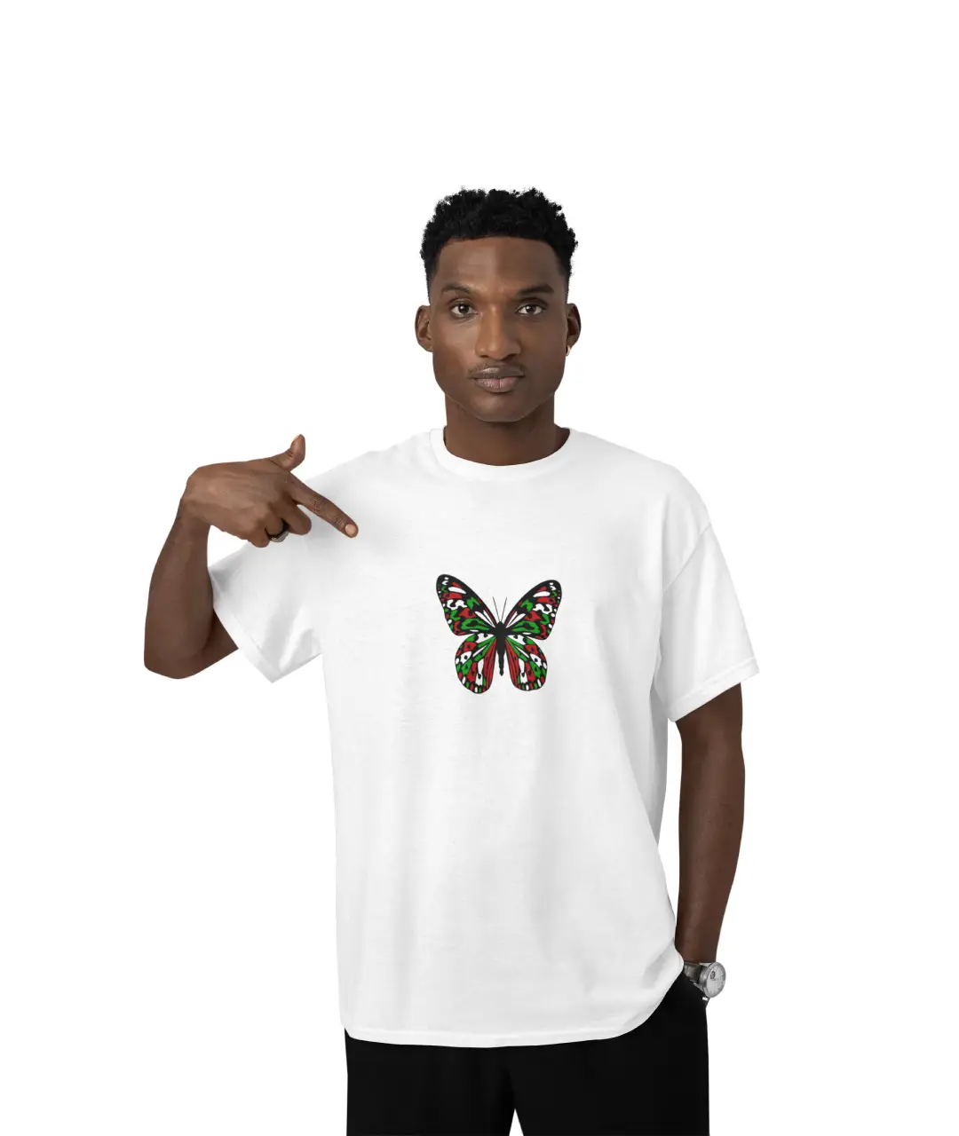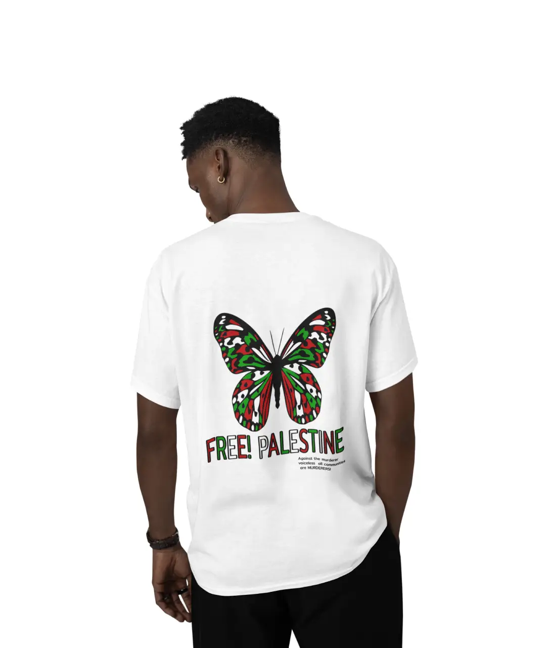 Arka kısmında büyük kelebek tasarımının yanı sıra “FREE! PALESTINE” yazısı yer almakta olup, adaleti ve özgürlüğü destekleyen güçlü bir görselliğe sahiptir. Günlük kombinlerinize anlam katacak bu t-shirt, kot pantolonlar, şortlar veya joggerlarla mükemmel uyum sağlar.