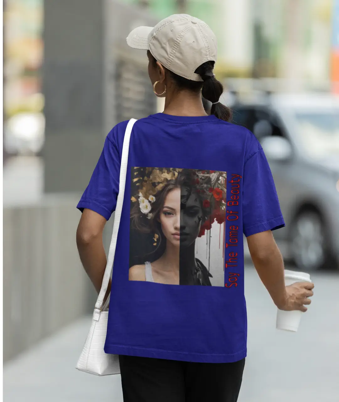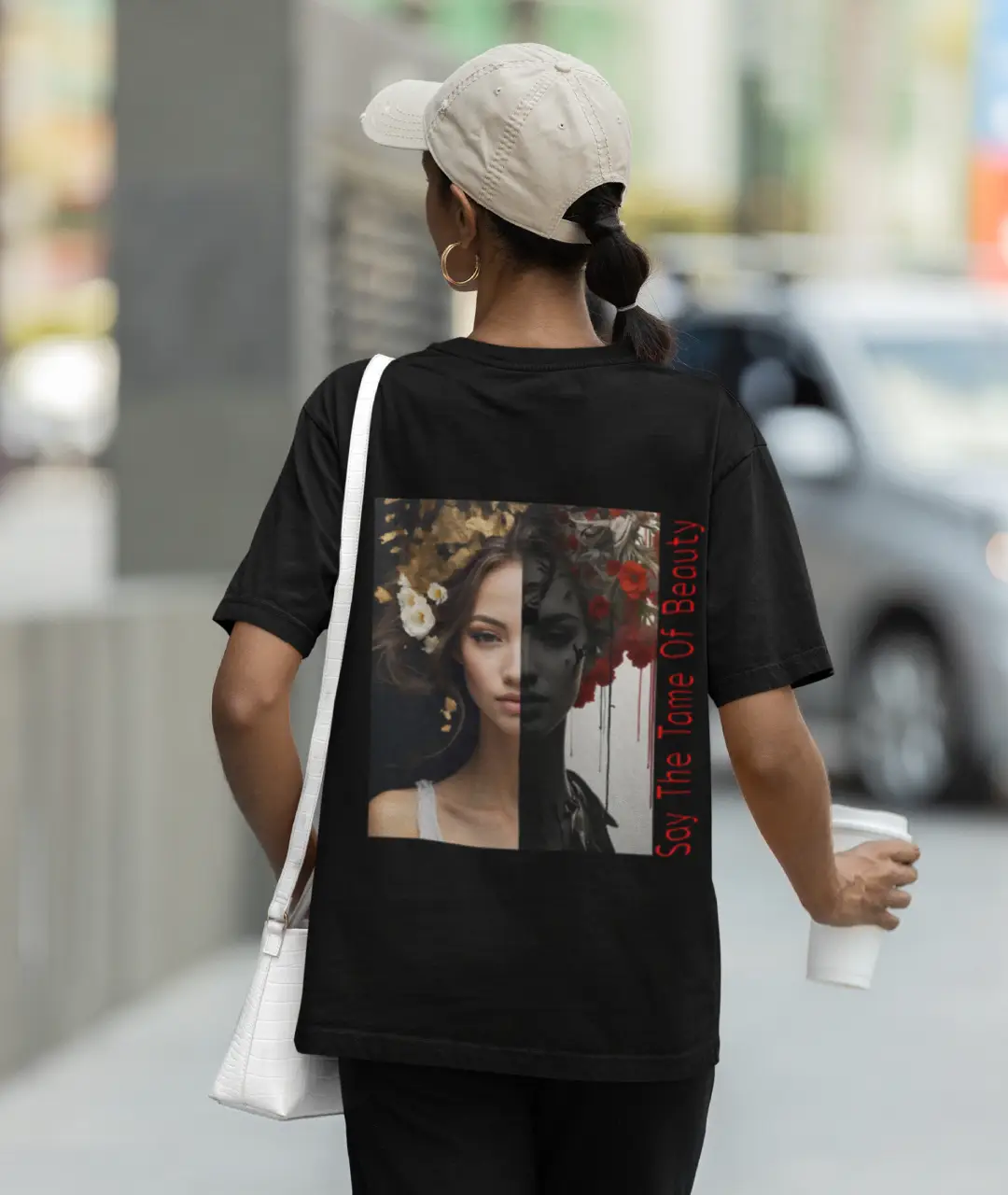 Sanatı ve modayı bir araya getiren kadın baskılı tişört, özgün tasarımı ve kaliteli kumaşıyla fark yaratıyor. Üzerinde yer alan “Say The Tame Of Beauty” baskısı, güzelliğin iki yönünü yansıtan eşsiz bir sanat eseri olarak karşımıza çıkıyor. Bir yüzü doğallığı ve zarafeti simgelerken, diğer yüzü gotik ve dramatik bir etki yaratıyor. Bu etkileyici baskı, tişörtü yalnızca bir kıyafet olmaktan çıkarıp sanatsal bir ifade aracına dönüştürüyor.