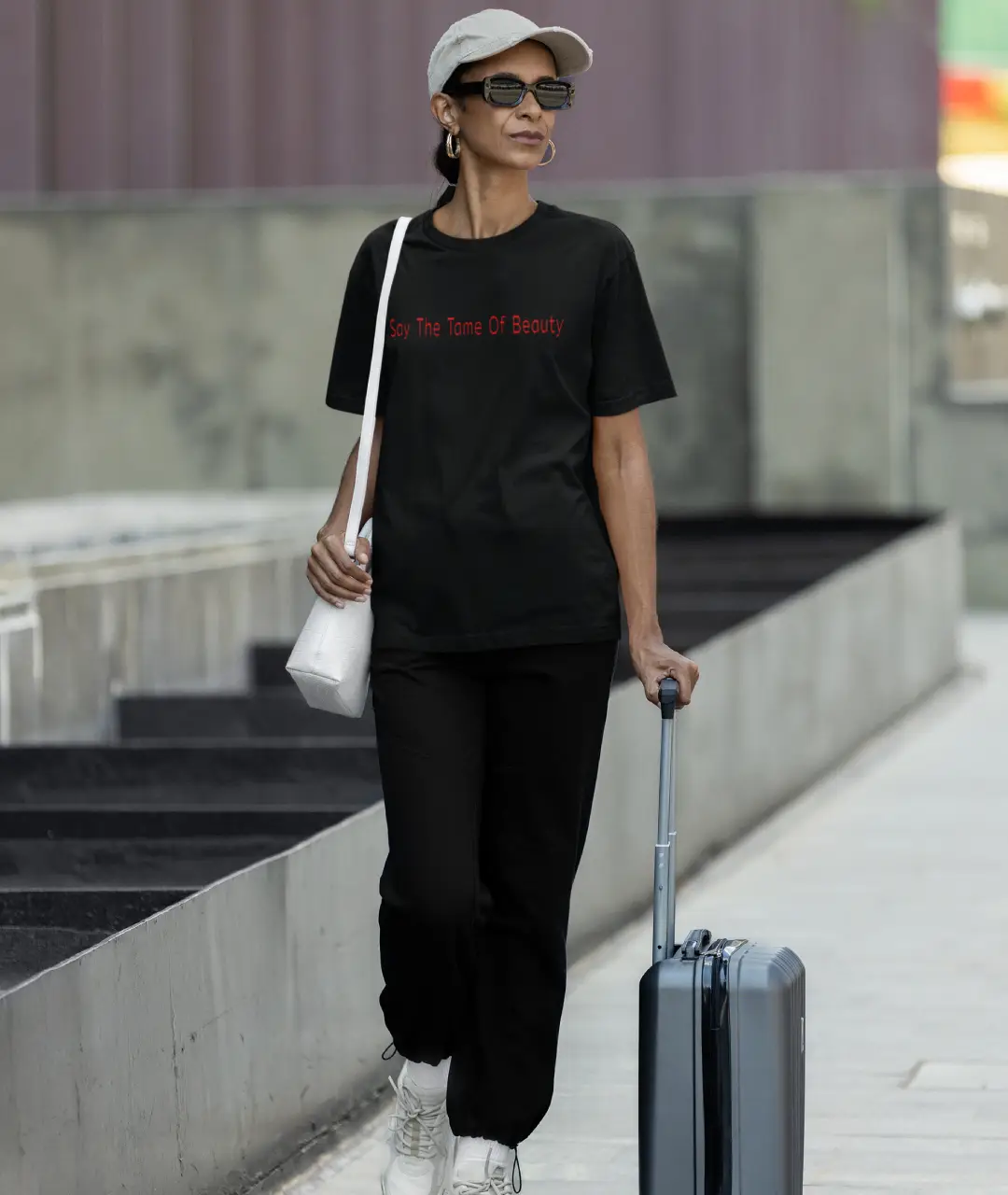• Ön yüzünde minimal bir şekilde kırmızı renkte “Say The Tame Of Beauty” yazısı yer alırken, arka tarafta sanatsal bir baskı bulunmaktadır.