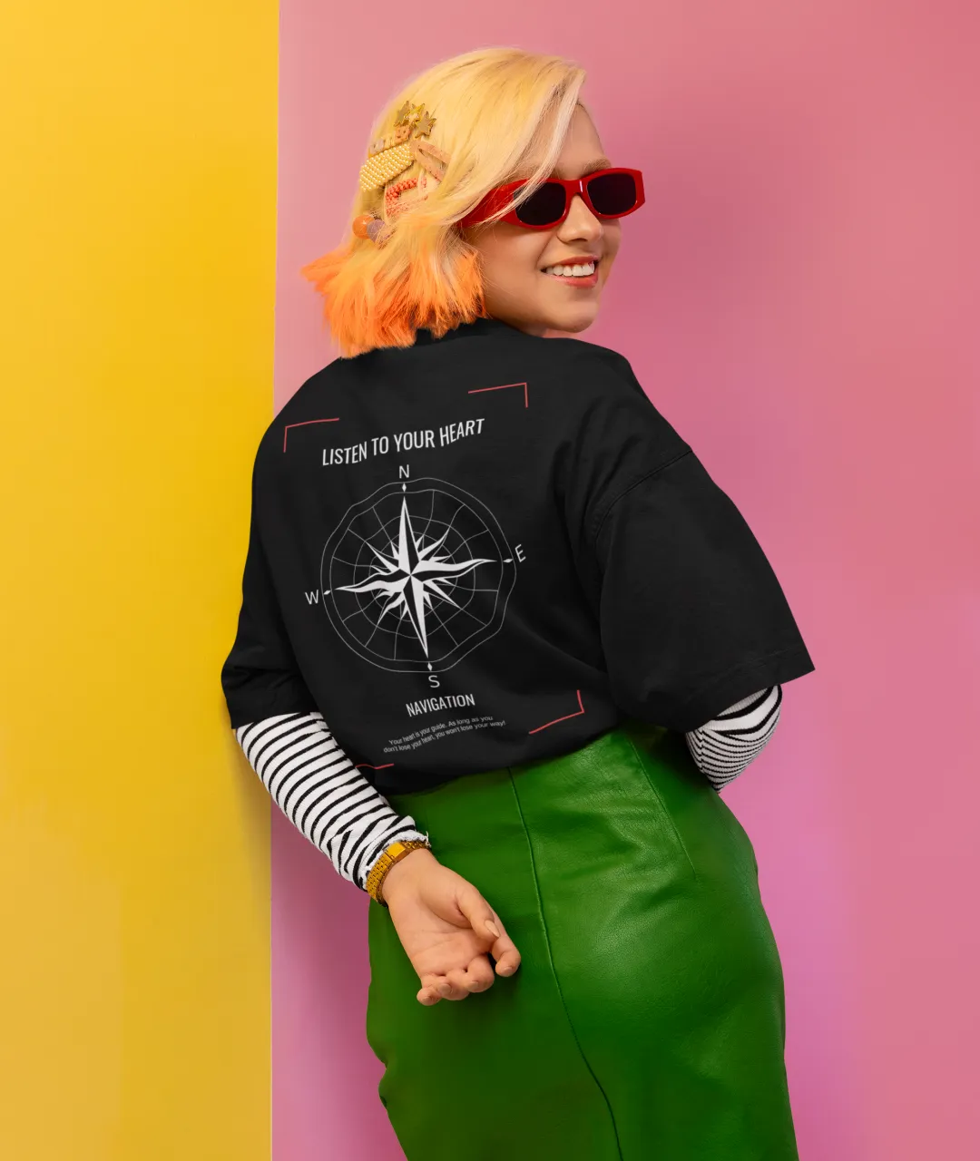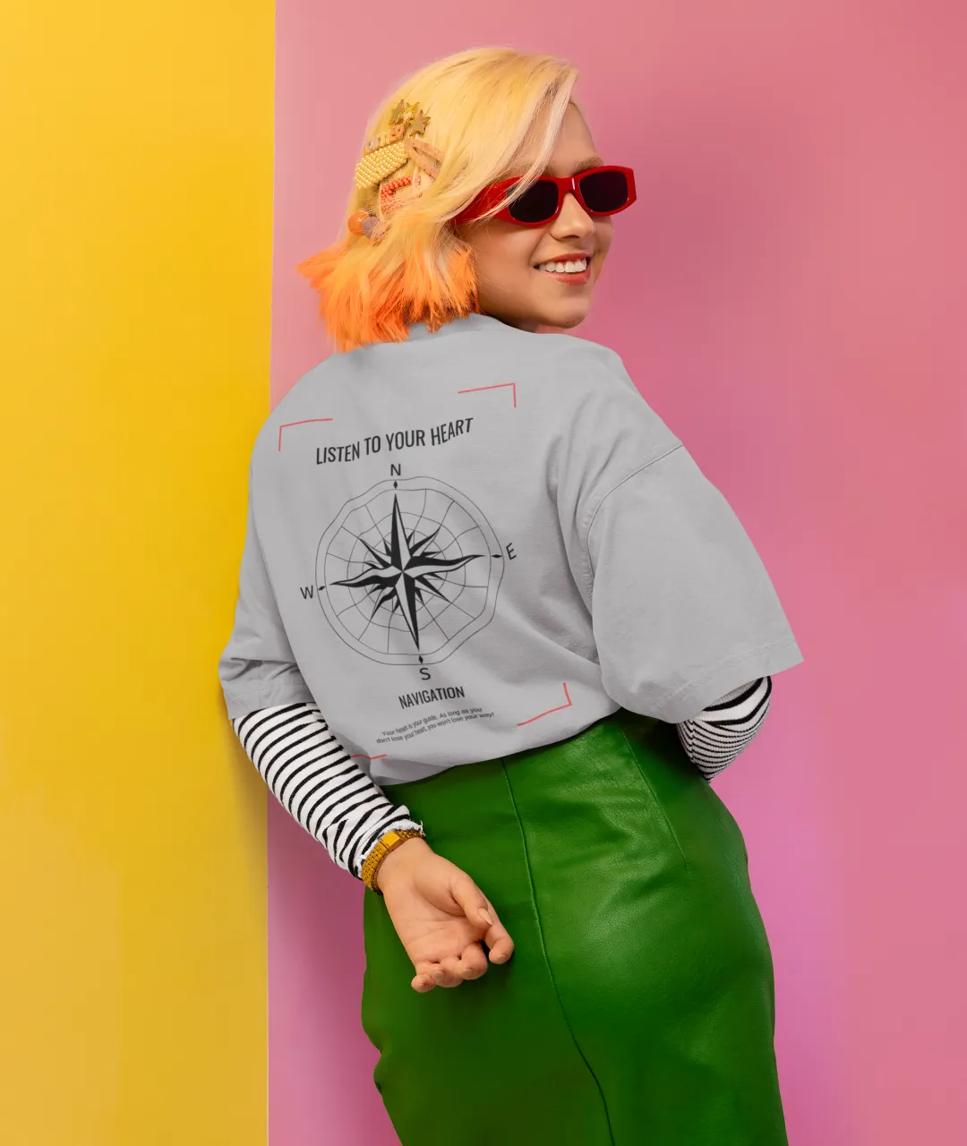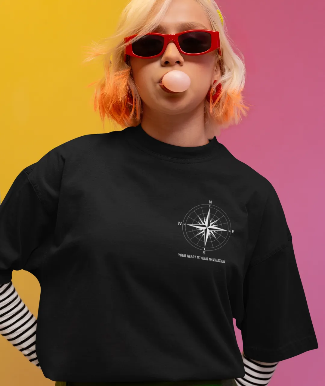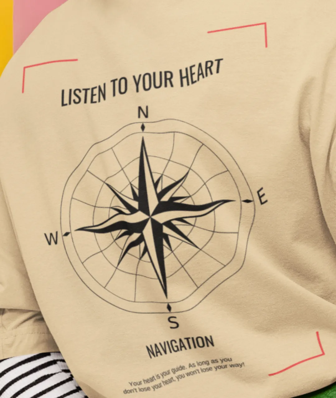 Tasarımın en dikkat çeken kısmı, ön tarafta yer alan pusula simgesi ve yazının minimal ama etkili duruşudur. Arka kısımdaki büyük pusula baskısı ise ürüne güçlü bir karakter kazandırır. Pusula, yüzyıllardır yön bulmanın en önemli simgelerinden biridir ve bu tişörtteki mesajla birleştiğinde, sadece bir giyim parçası olmaktan çıkarak kişisel bir ifade biçimi haline gelir. “Kalbini dinle” mesajı, kendi yolunu çizmek isteyenler için hem estetik hem de anlamlı bir motivasyon kaynağıdır.