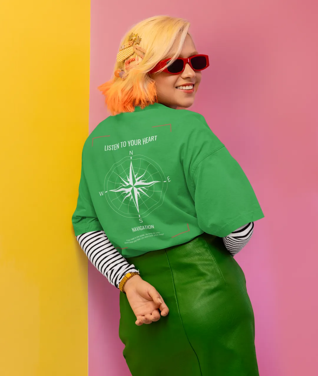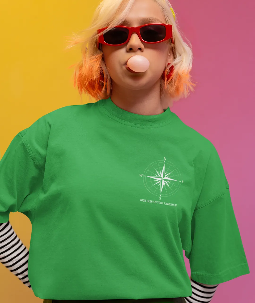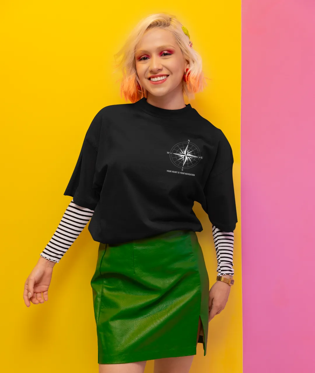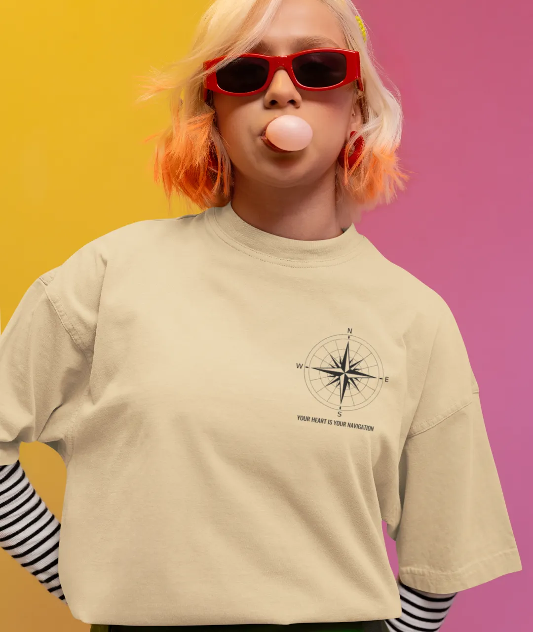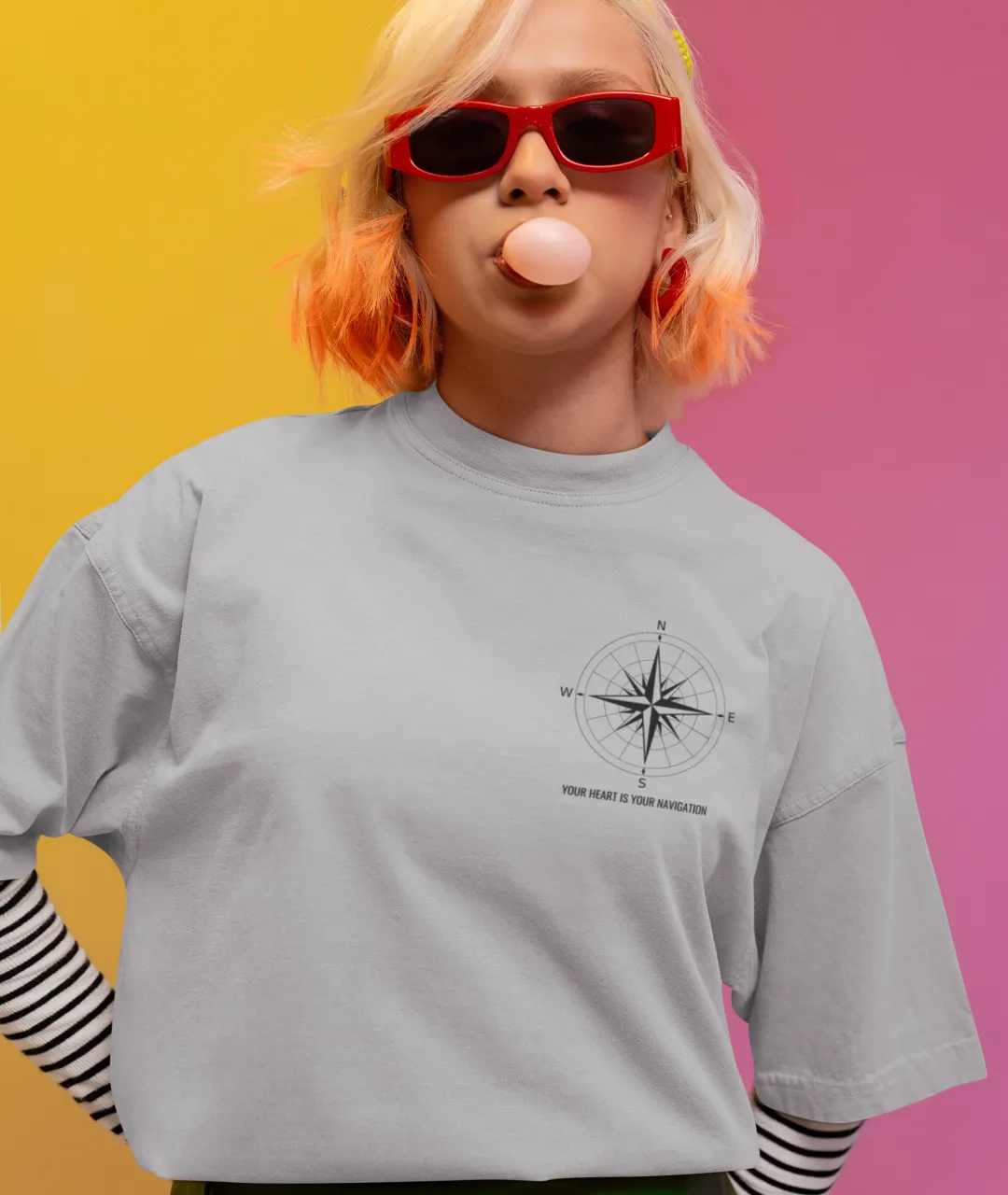 Tasarımın en dikkat çeken kısmı, ön tarafta yer alan pusula simgesi ve yazının minimal ama etkili duruşudur. Arka kısımdaki büyük pusula baskısı ise ürüne güçlü bir karakter kazandırır. Pusula, yüzyıllardır yön bulmanın en önemli simgelerinden biridir ve bu tişörtteki mesajla birleştiğinde, sadece bir giyim parçası olmaktan çıkarak kişisel bir ifade biçimi haline gelir. “Kalbini dinle” mesajı, kendi yolunu çizmek isteyenler için hem estetik hem de anlamlı bir motivasyon kaynağıdır.