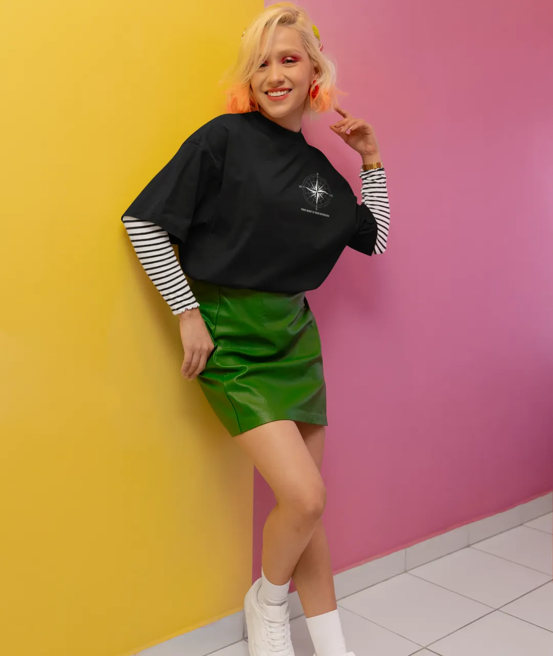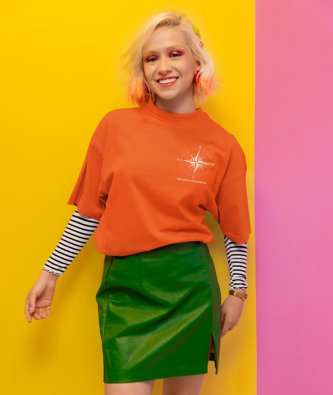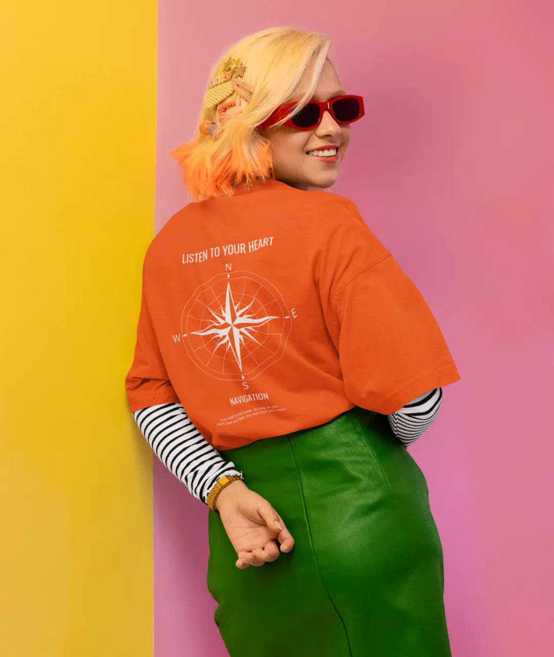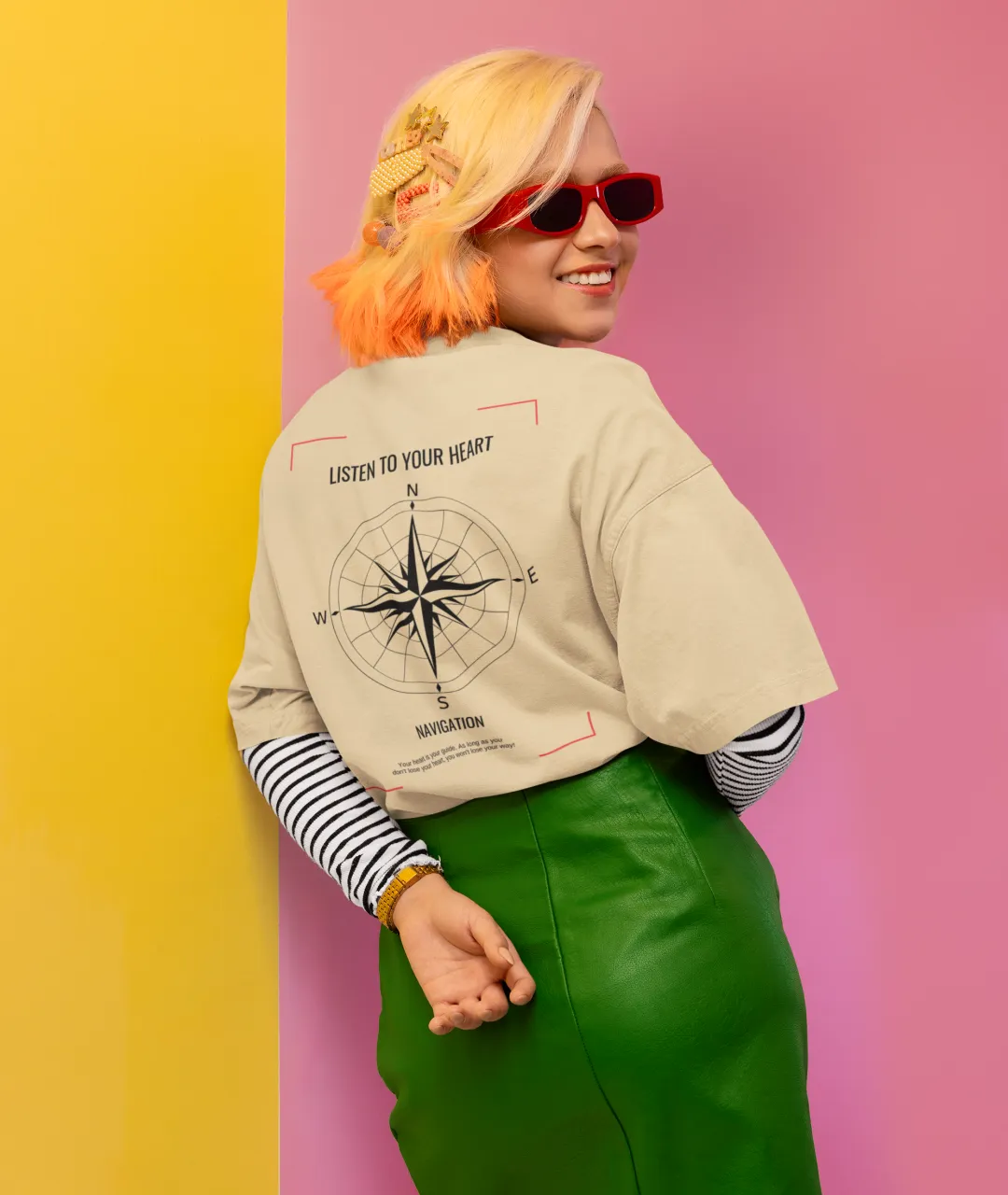 Tasarımın en dikkat çeken kısmı, ön tarafta yer alan pusula simgesi ve yazının minimal ama etkili duruşudur. Arka kısımdaki büyük pusula baskısı ise ürüne güçlü bir karakter kazandırır. Pusula, yüzyıllardır yön bulmanın en önemli simgelerinden biridir ve bu tişörtteki mesajla birleştiğinde, sadece bir giyim parçası olmaktan çıkarak kişisel bir ifade biçimi haline gelir. “Kalbini dinle” mesajı, kendi yolunu çizmek isteyenler için hem estetik hem de anlamlı bir motivasyon kaynağıdır.