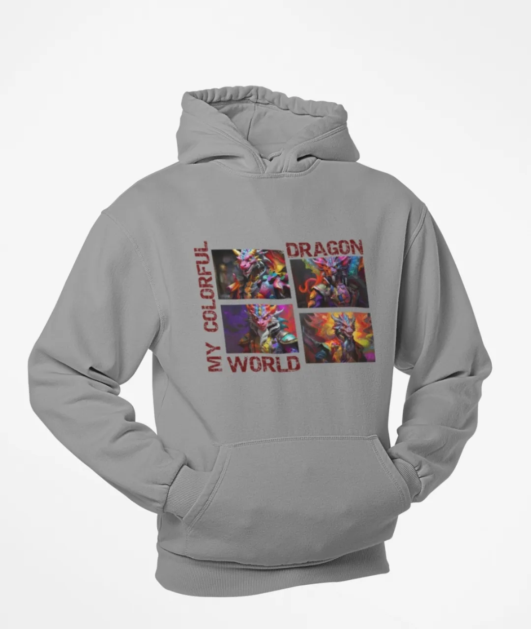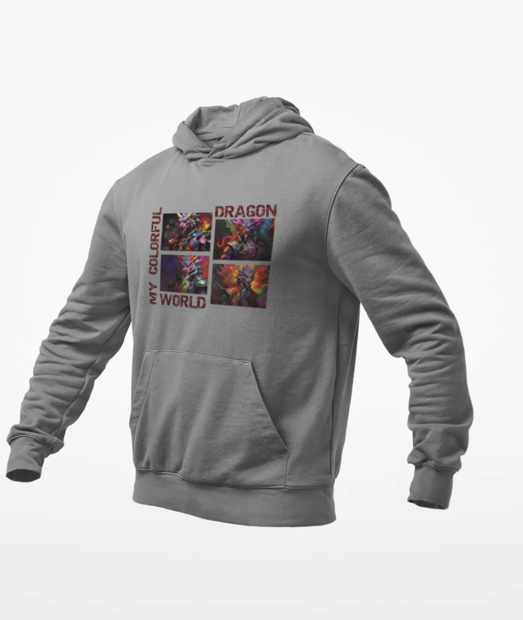 “MY COLORFUL DRAGON WORLD” yazısı, tasarımı tamamlayarak bu hoodie’yi yalnızca bir giyim ürünü olmaktan çıkarıp bir fantastik sanat eseri haline getiriyor.