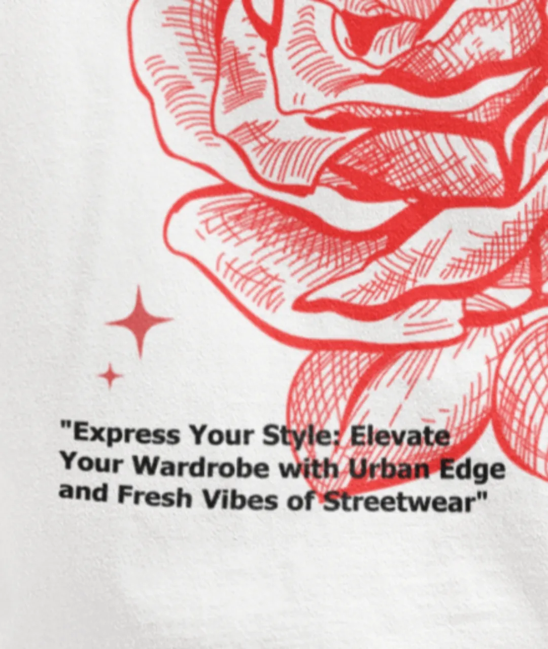 T-shirt’ ün sırt bölgesindeki büyük baskı, sanatsal bir görünüm sunarken, kol bölgesindeki ek gül detayları tasarımın bütünlüğünü tamamlayarak zarif bir hava katıyor. Yazı tipi cesur ve dikkat çekici olup, t-shirt’ü şık ve modern bir parçaya dönüştürüyor. Arka baskının alt kısmında yer alan küçük tipografi detayı, “Express Your Style with Unique Streetwear Spirit and Fresh Vibes of Heritage” yazısı ile giyenin tarzını ifade etmesine olanak sağlıyor.
