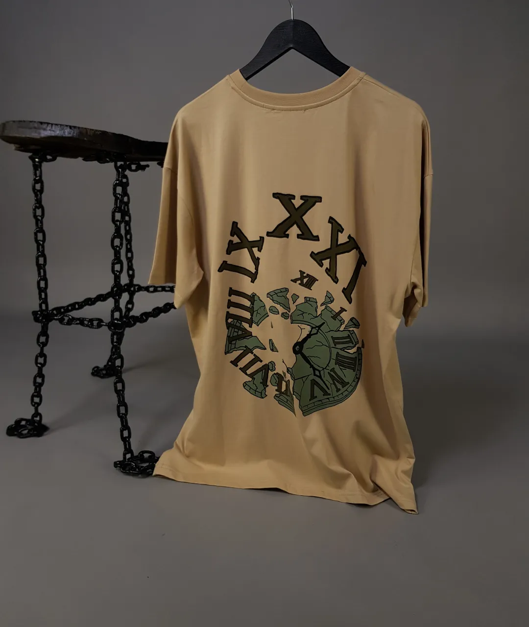 Antik çağlara gönderme yapan bu görsel, modern zamanın kaotik yapısı ile harmanlanarak sanatsal bir stil ortaya koyar. Bu tişört, sadece bir giyim ürünü değil, aynı zamanda bir ifade biçimidir. Herkesin zamanla bir savaşı vardır. Bu tişört, o savaşı stilinize yansıtmanın en şık yoludur.