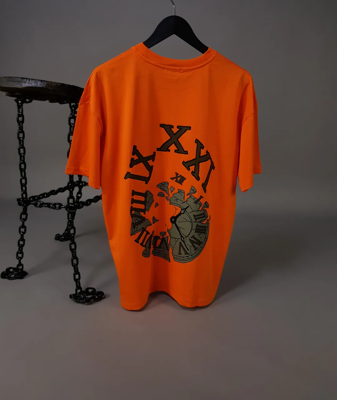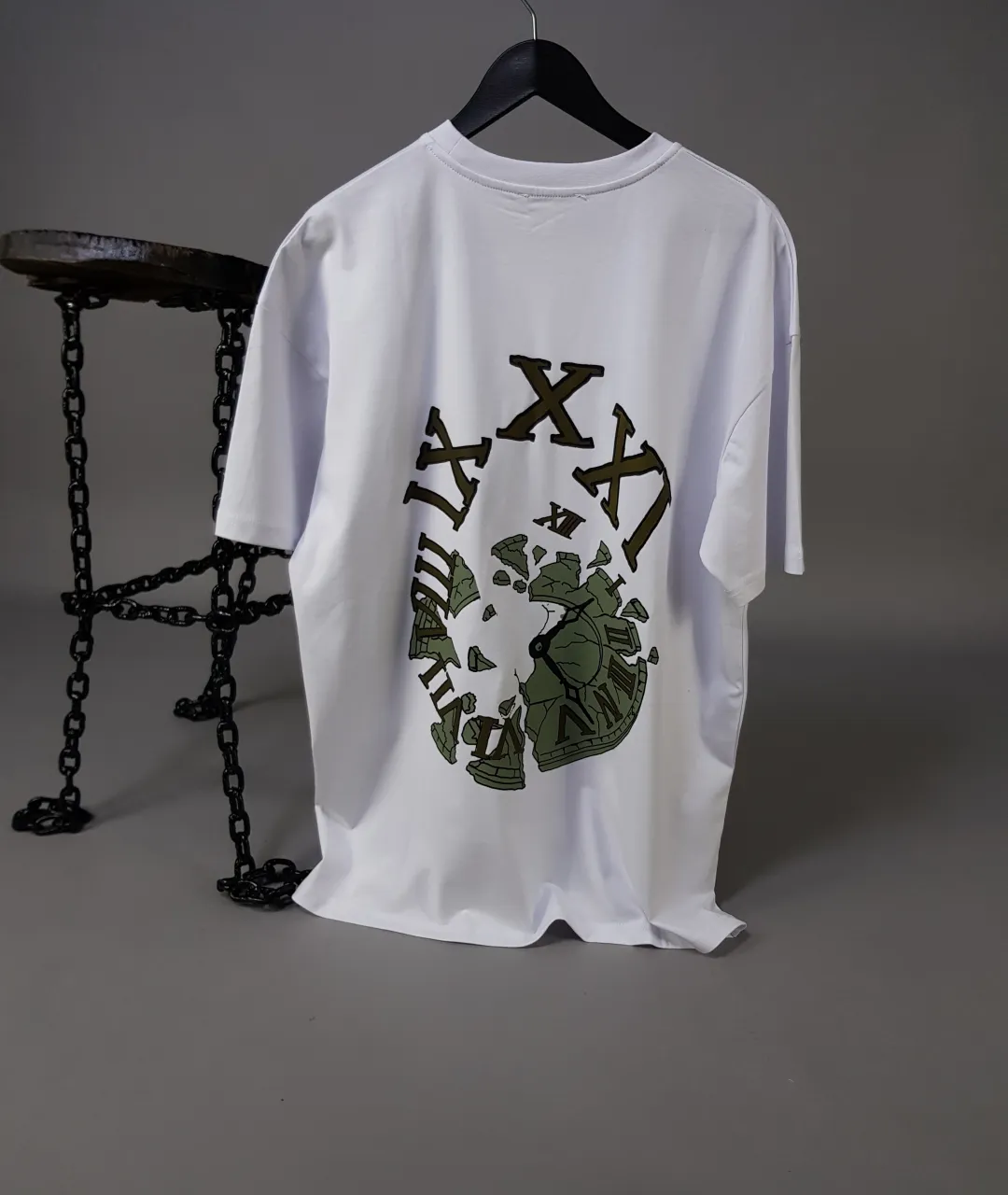 Tişörtün ön yüzünde, sol göğüs hizasında yer alan küçük boyutlu saat baskısı, zarif ve minimalist bir dokunuş sunar. Arka yüzünde ise dikkat çekici ve büyük bir tasarım yer almaktadır: Antik Roma rakamlarıyla bezenmiş, parçalanmış ve kırılmış bir saat görseli. Bu saat, zamanın tek yönlü akışını, yıkıcı gücünü ve kaçınılmaz sonunu simgeler. “Zamanın Parçalanışı” ismini tam anlamıyla yansıtan bu desen, hem felsefi hem de estetik bir mesaj taşır.